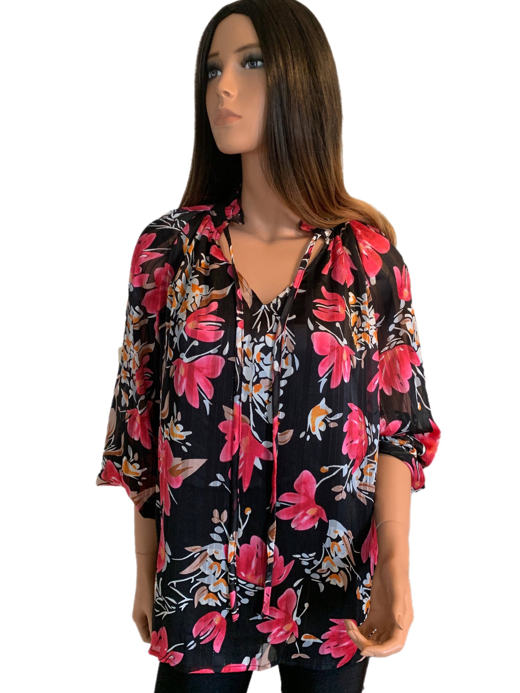 Black & Fuchsia Floral V-Neck Tie 3/4 Sleeve Textured Blouse