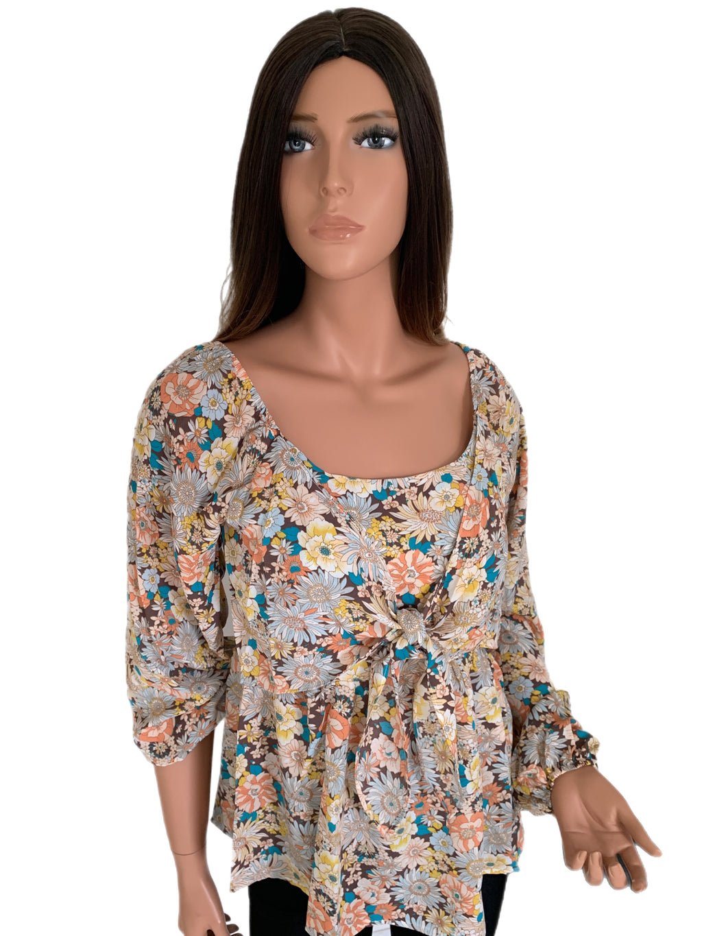 Cream Black Floral V-neck Dolman Short Sleeve Blouse